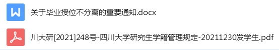 重要提醒:2021年12月30日研究生院下发了《四川大学研究生学籍管理规定(2021年修订)》的通知(已于当日分享在管理群内),请特别注意其中 “自2022年9月1日起,学校不再实行研究生毕业授位分离制度”及“结业”条款新规定,请各位同学务请知晓并重视。