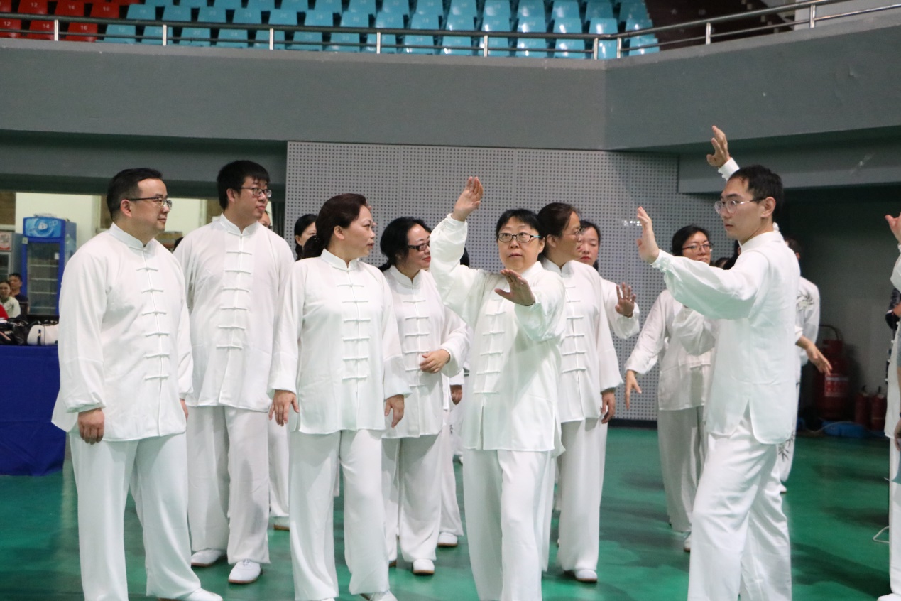 据悉,此次共有36支队伍参赛,分成18个小组。我院教职工作为第一小组闪亮登场。随着轻柔古典的音乐响起,教职工们迅速摆起“抱拳”的姿势。然后慢慢放下手,开始伴着配乐的节奏,整齐有序地完成动作。学院教职工们的动作时而轻柔,时而稳重,用肢体语言消解工作中的疲惫,展现出太极文化的刚柔并济。