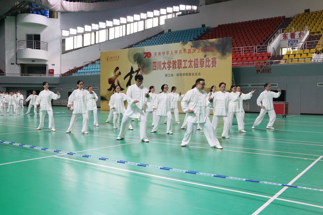 10月18日下午两点,“健魄铭志·修身强国”——四川大学庆祝新中国成立 70 周年教职工太极拳比赛在望江校区体育馆二楼主馆隆重举行。本次比赛由四川大学学工会、四川大学体育学院联合主办,旨在庆祝新中国 70 周年华诞,弘扬中华传统文化,传承太极文化精髓,倡导广大教职工走出办公室、走上运动场,丰富校园文化生活,展示我校教职工健康向上的良好精神风貌。我院教职工在此次比赛中荣获三等奖。