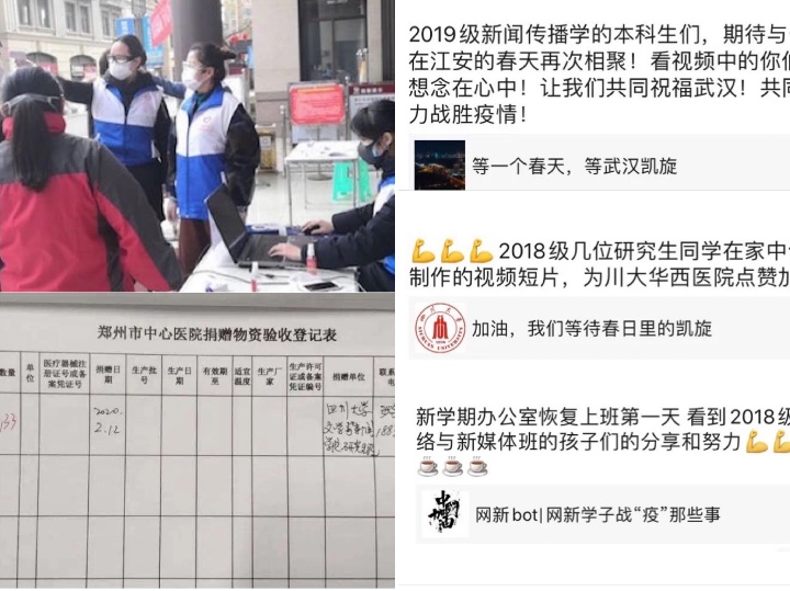 疫情爆发以来,我院不少同学通过多种方式,志愿参与抗疫服务,传递温暖。2019级100余名硕士研究生自发筹款,为前线医务工作者募集133副护目镜,由张宇轩为前线医务工作者送去护目镜。2017级新闻学专业本科生张恩铭同学主动报名家乡发起的“关爱抗疫医护人员子女志愿辅导团”,为一位父亲正奋战在南充抗疫一线的高三男孩进行线上学习辅导,主动关心对方情况。2017级网络与新媒体专业本科生王小翠报名参与“雷火救援志愿者”,协助打通救援的信息通道。