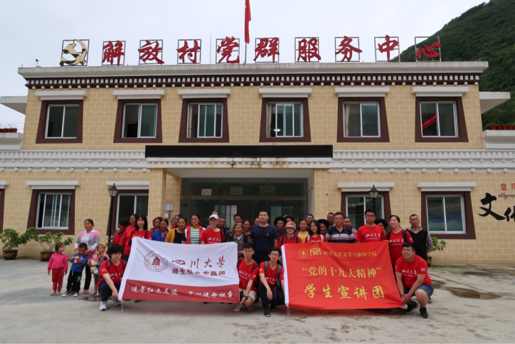 实践队的第一站是解放村。宣讲活动上,解放村第一书记王书记向大家介绍了村子近年来特色产业增收、教育扶贫等方面的情况。张莹老师介绍学院概况及专业特点,干天全老师则用四川话和村民们“拉起了家常”。