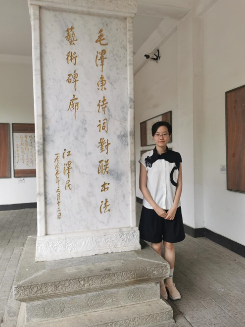 8月21日下午,李佰珏来到位于湖南省长沙市的中共湘区委员会旧址暨毛泽东、杨开慧故居,追寻红色足迹。李佰珏首先走过毛泽东诗词对联书法艺术碑廊,欣赏了毛泽东及其后人的书法作品。随后,她经过了毛泽东塑像广场,塑像所表现的是毛泽东头戴军帽、身穿军大衣,向群众挥手致意的形象。继而向东行进,李佰珏走进了中国共产党长沙历史馆,展馆共分为六个展厅,展现了1919年至今长沙城的历史变迁与共产党人的革命成就。经过此次实践活动,李佰珏重温了一座城的红色记忆,跟着中共先辈的脚步,回顾见证了长沙的崛起。她深刻认识到传承仍在继续,中国梦的实现、民族的崛起将是自己这一代人义不容辞的使命。