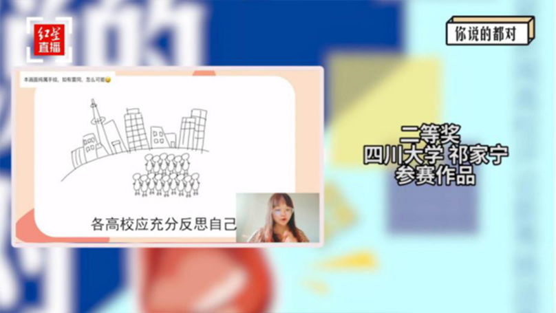最终,我院祁家宁、王北辰、雷思远等10名同学进入比赛“30强”并荣获嘉奖,颁奖仪式于9月11日以线上直播形式举行。通过本次比赛,我院学子体验了融媒体时代新闻评论的跨媒介叙事方式,进一步增强了新闻评论的写作与表达能力,在“声情并茂”中凸显了价值与理性表达的可能性。“此次比赛以大众投票+专业评委分梯次打分的严格赛制,选拔出了视频评论中的佼佼者。”赵瑜说,“从报名看,四川大学的参赛人数是最多的,他们多层次展现了对同一个话题不同角度的理解,各具特色,潜力无限。”