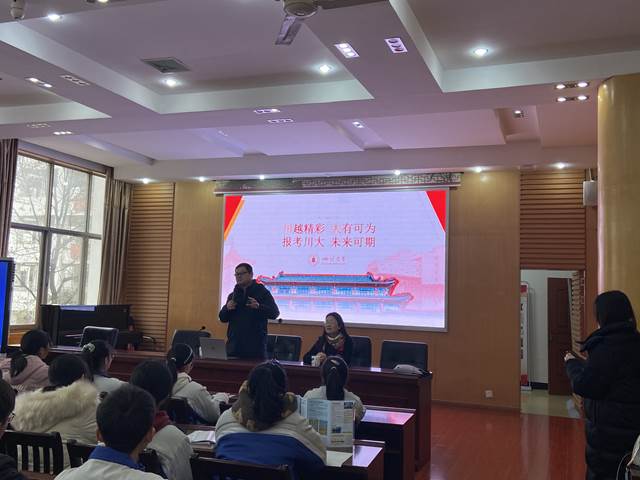 12月1日-3日,招生工作组前往江西省南昌市莲塘中学进行招生宣讲。宣讲会伊始,招生工作组先请同学们观看了四川大学招生宣传片,展示了我校校园风光、文化底蕴、学科配置以及食堂丰富的菜品。随后,周维东副院长以“什么是大学,为什么选择四川大学”为题,为同学们开展了专题讲座。周维东副院长用通俗易懂的语言,向莲塘一中的同学们介绍了我校的历史、优势专业以及学生培养情况等,让同学们对四川大学有了一个初步了解。此外,他还向同学们介绍了四川省的风土人情,幽默风趣的话语引得同学们掌声不断。之后,我院本科教务办周仁平主任、招生联络员刘天泉老师分别向同学们介绍了我校的招生和录取政策、国际交流情况以及“拔尖计划”和“强基计划”的情况。当同学们听到学校每年设立专门资金资助学生开展交流活动时,爆发出了一阵热烈的欢呼和掌声。宣讲会后,不少同学留下来咨询我校在江西省的招生情况以及拔尖计划和强基计划的录取情况,周维东教授、周仁平老师和刘天泉老师进行了耐心、细致的解答。