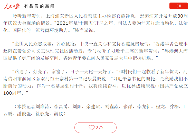 《人民日报》2021年的新年报道中,赵阳代表香港青年发言
