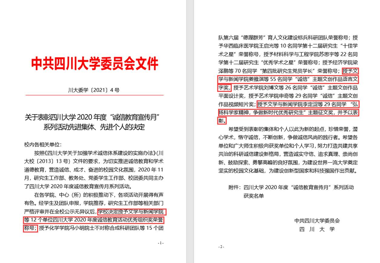 四川大学2020年度“诚信教育宣传月”系列活动由研究生工作部、教务处、党委学生工作部、校团委共同主办,旨在推进诚信教育和学术道德教育,营造诚信、成才、奋进的校园文化氛围。在1月14日发布的《关于表彰四川大学2020年度“诚信教育宣传月”系列活动先进集体、先进个人的决定》中,我院获先进集体和先进个人奖项及表彰。