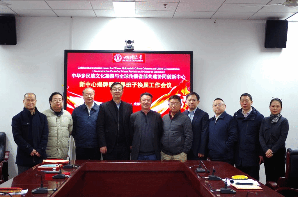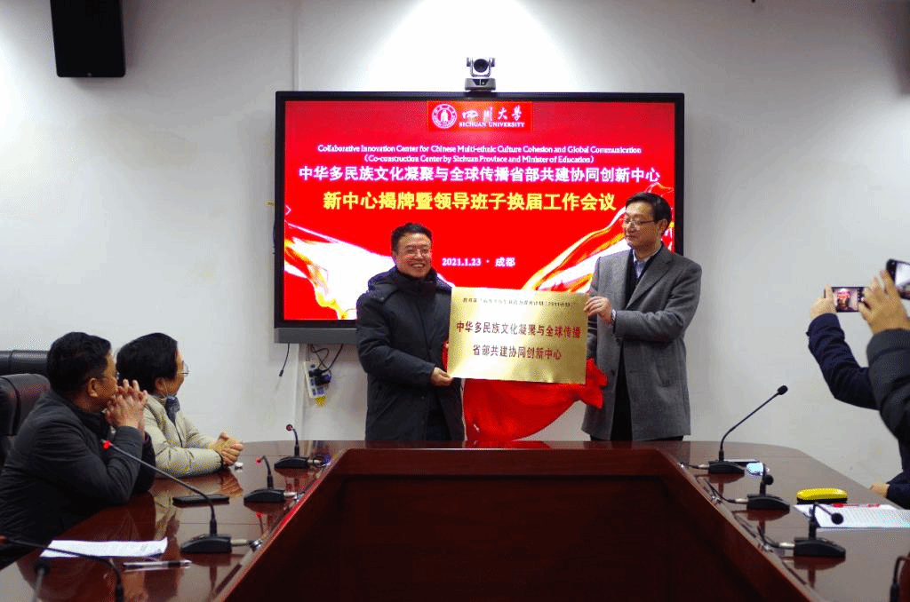 2020年9月,由我院牵头组建的“中华多民族文化凝聚与全球传播省部共建协同创新中心”获教育部认定,成为四川省第一个文科省部共建协同创新中心。2021年1月23日上午,为在新的一轮建设期中进一步强化牵头高校的主体责任,成功获批的新中心揭牌仪式暨领导班子换届工作会议于江安校区文科楼一区418会议室顺利举行。