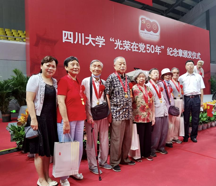 6月23日上午,四川大学“光荣在党50年”纪念章颁发仪式在望江体育馆隆重举行。我院卢延权、易明善、夏淑芬、舒中惠、李朝正、曾繁铭、吴茂楠等7位满50年党龄的老党员在学院党委书记古立峰教授、工会主席罗梅研究员、党政办公室刘诗诗老师的陪同下出席了颁发仪式。另有赵振铎、邱俊鹏、梁德曼、张祖权等4位老党员因身体不便未能出席。