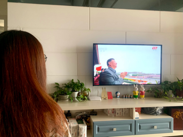 观看庆典直播的我院老师高唱国歌