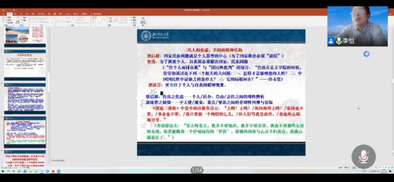 当天下午,我院院长李怡教授带来“日本体验与郭沫若诗歌的意象嬗变——以‘海洋’、‘松’、‘梅’为例”的主题讲座,从比较文学的方向探讨研究了日本文学,讲述了鲁迅、郭沫若在日的文学经历等。同学们通过线上直播“云”学习,开拓了自己的文学视野。