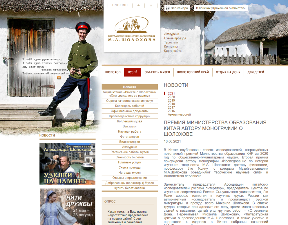 近日,俄罗斯国立肖洛霍夫故居博物院官网刊发题为《中国教育部授予肖洛霍夫研究者奖项》(ПремияМинистерстваобразованияКитаяавторумонографии о Шолохове)的新闻,详细介绍了我院刘亚丁教授关于肖洛霍夫的研究成果及其与俄方学界的交流经历,对其学术工作的意义予以高度评价。