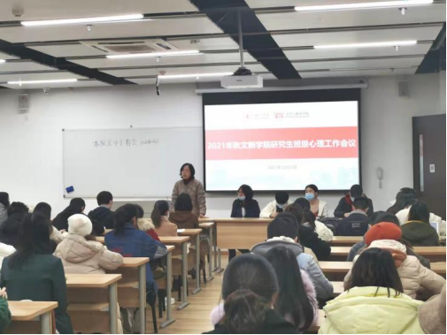 2021年12月1日中午,我院“研究生班级心理会议”在文科楼一区109召开。我院党委副书记张莹老师、文新嘤鸣坊负责人段化鞠老师、博士生辅导员吴光芬老师、2021级硕士辅导员王志华老师、2020级硕士辅导员雷子慧老师、2019级硕士辅导员陈羲老师以及研究生各班级心理工作负责人等80多人参加了会议。