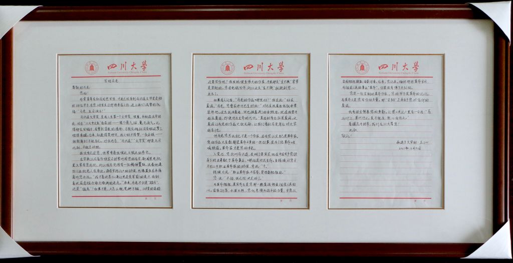 王沁是第七届“马识途文学奖”一等奖的获得者,本科阶段曾经攻读法学的他现在已经在四川大学文学与新闻学院攻读硕士学位。王沁在信中写道:“对我而言,‘马识途’、‘文学奖’是无可比拟、不能忘怀的。”他在面对川大中文系时,曾经十分没有底气,但是“知道得奖那天,一夜未眠,被鼓舞到不能自已。”