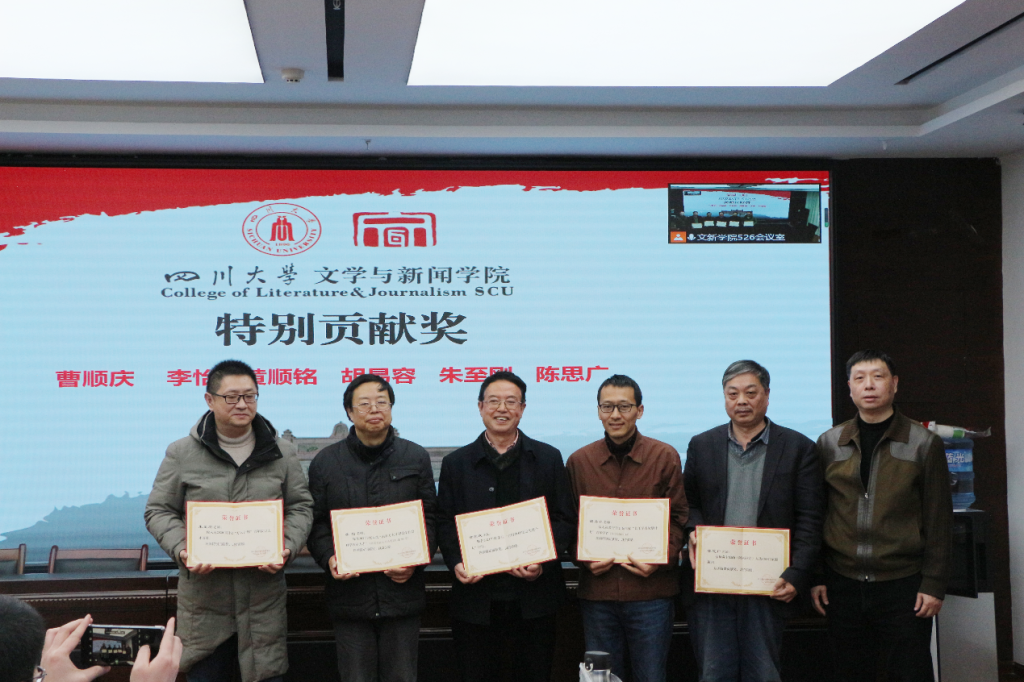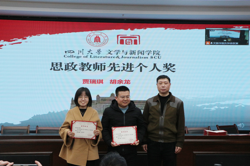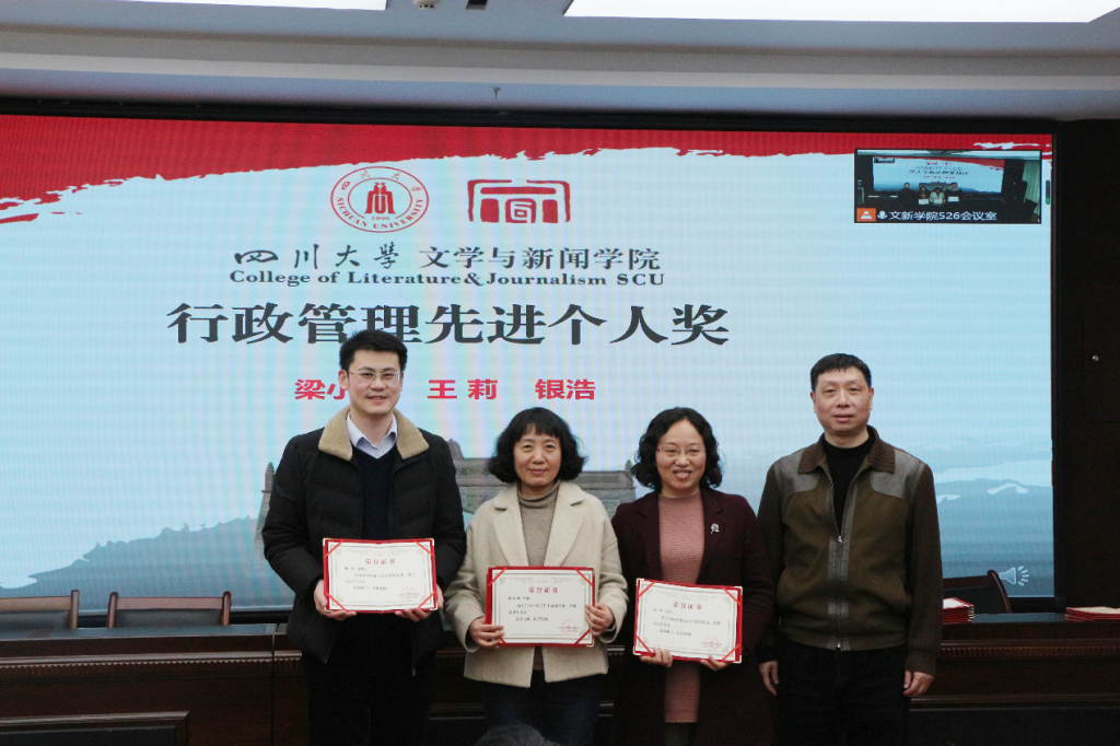 年度工作总结和新学期相关工作布置说明结束后,古立峰书记宣布2021年我院对各项工作表彰的获奖名单并说明了评奖原则。在欢快热烈的音乐中,古立峰书记、李怡院长与学术院长曹顺庆教授共同为我院获奖教职员工颁奖。
