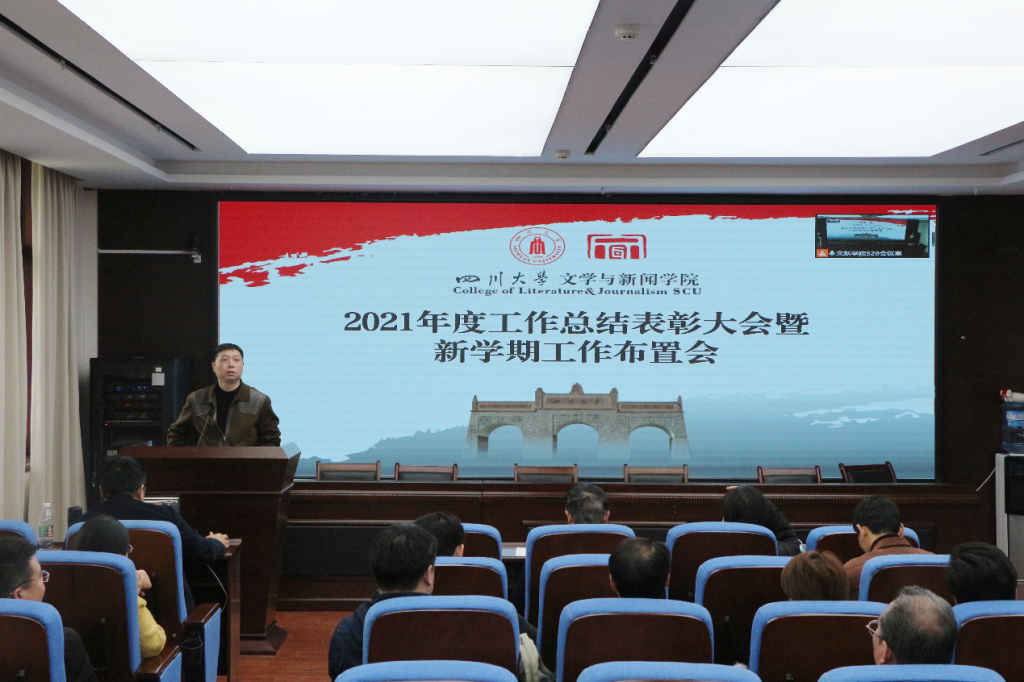 会议伊始,我院党委书记古立峰教授就学院2021年度工作进行总结,并介绍了加入我院的新教师:王兆鹏教授、肖伟胜教授、宋曜研究员、贺碧霄副教授、陶熠老师。这些新进老师先后发言,表达了加入川大文新学院的喜悦之情。