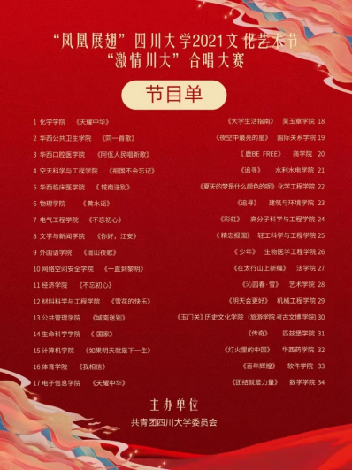 2022年4月16日下午,由我校团委主办的“凤凰展翅”四川大学2021年文化艺术节“激情川大”合唱大赛(初赛)在江安校区体育馆举行。受疫情影响,原定于2021年12月举办的合唱大赛延期至今年四月,活动全程严格遵守各级疫情防控规定和相关要求。学校严格把关参与师生的健康情况,除上台参演队伍外,现场所有参与人员全程规范佩戴一次性医用口罩,现场取消大众评审座位,评委嘉宾隔座入座,工作人员保持适当距离,各学院参赛队伍均采取“即赛即退场”形式。
