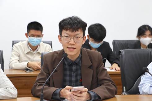 2019级网络与新媒体专业本科生张小艾同学第一个发言。作为学院团委学生会主席,张小艾同学从加强政治引领、巩固改革成果、聚焦服务职能、服务中心大局这四方面介绍了学院院响应总书记的号召并完成了学院、学生会的相关工作,同时表示,还将在总书记考察中国人民大学重要讲话精神的指引下,对标要求与目标继续努力,切实做好各项工作,不辱时代使命。