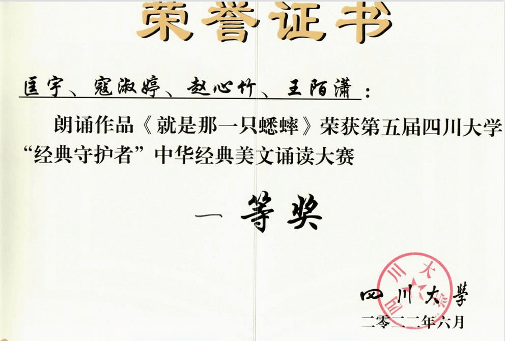 2022年6月9日晚7点,第五届四川大学“经典守护者”中华经典美文诵读大赛决赛在江安校区艺术学院小剧场举行。我院匡宇副教授、寇淑婷副教授、赵心竹老师和王陌潇老师共同朗诵的参赛作品《就是那一只蟋蟀》荣获一等奖。