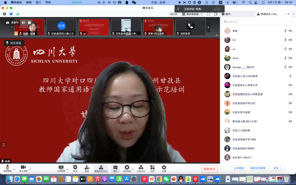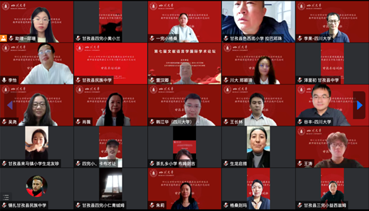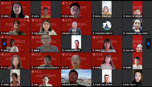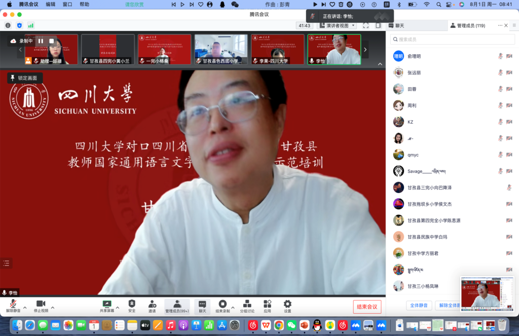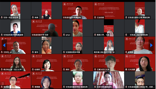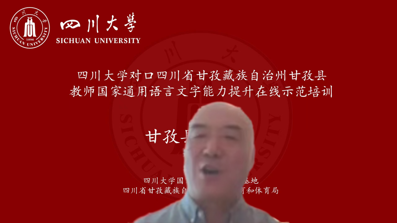 为深入贯彻党的十九大和十九届历次全会精神,落实全国语言文字会议和教育部党组关于教育脱贫攻坚成果同乡村振兴有效衔接的工作部署,2022年8月1日上午8点30分,四川大学国家语言文字推广基地对口四川省甘孜藏族自治州甘孜县教师国家通用语言文字能力提升在线示范培训举行了线上开班典礼。出席此次典礼的嘉宾有我校人事处处长、国家语言文字推广基地常务副主任、语言文字工作委员会办公室主任吴尧教授,语言文字工作委员会办公室副主任朱莉老师,我院院长李怡教授,我校国家语言文字推广基地执行主任雷汉卿教授,甘孜县教育和体育局股长孙冬梅,我校人事处副处长王彤伟教授等14位专家教师、20位学生教员及全体参训学员。开班典礼由我院院长李怡教授主持。