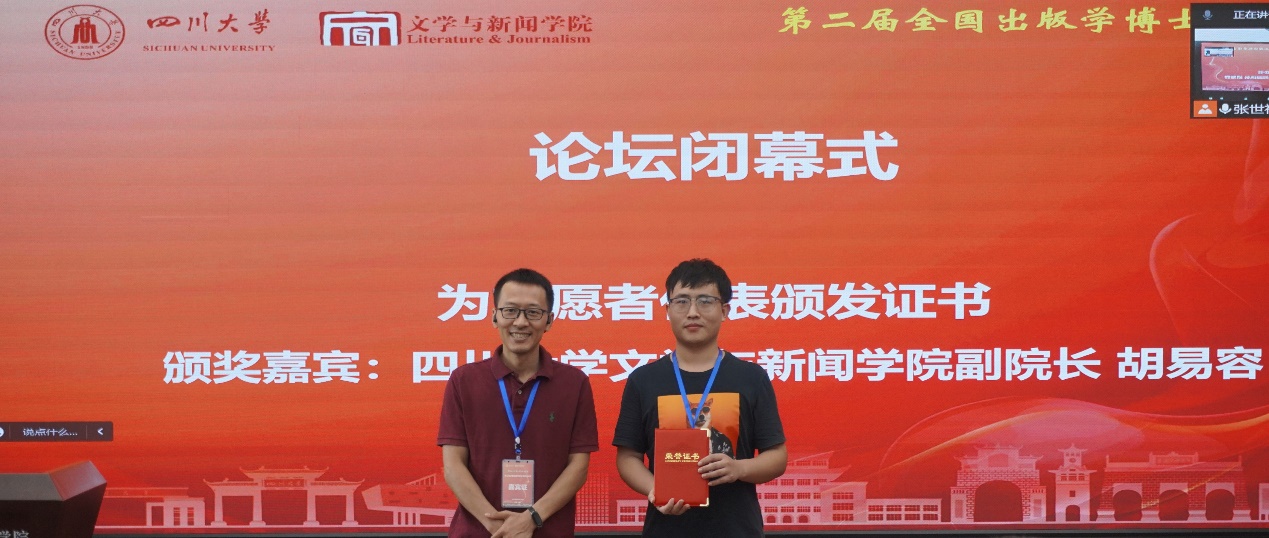 闭幕式中,西南政法大学裴永刚教授、《中国出版史研究》编辑张玉亮、我院王炎龙教授为获奖论文代表颁奖,我院副院长胡易容教授为志愿者代表颁发了证书。