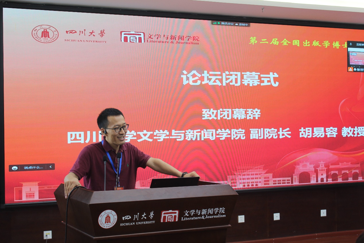 四川大学文学与新闻学院副院长胡易容教授致闭幕词,他简要介绍了学院学科建设及科研育人的特色举措,以及学院出版学科的发展简况。他表示,博士生论坛这个学术交流平台对人才培养有着十分重要的促进作用,本届论坛的举办是川大出版学院落实打造人才培养新标杆的系列举措之一,并对出版学青年博士发出了邀请。
