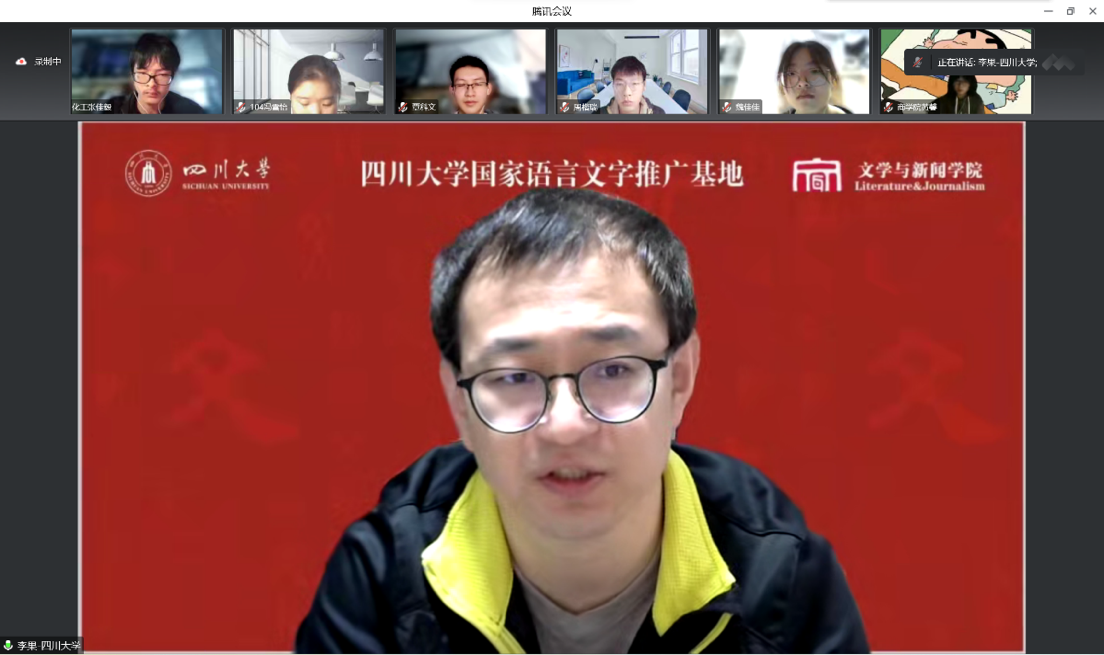 本次培训开班仪式由我校人事处副处长王彤伟教授主持。四川大学国家语言文字推广基地执行主任雷汉卿教授、基地办公室主任李宇凤副教授,以及基地18位专家共同出席了本次培训开班仪式,在线参训学员达200余名。开班仪式上,王彤伟教授表示川大国家语言文字推广基地对此次培训的高度重视,并为全体参训学员介绍了本次培训的师资力量。