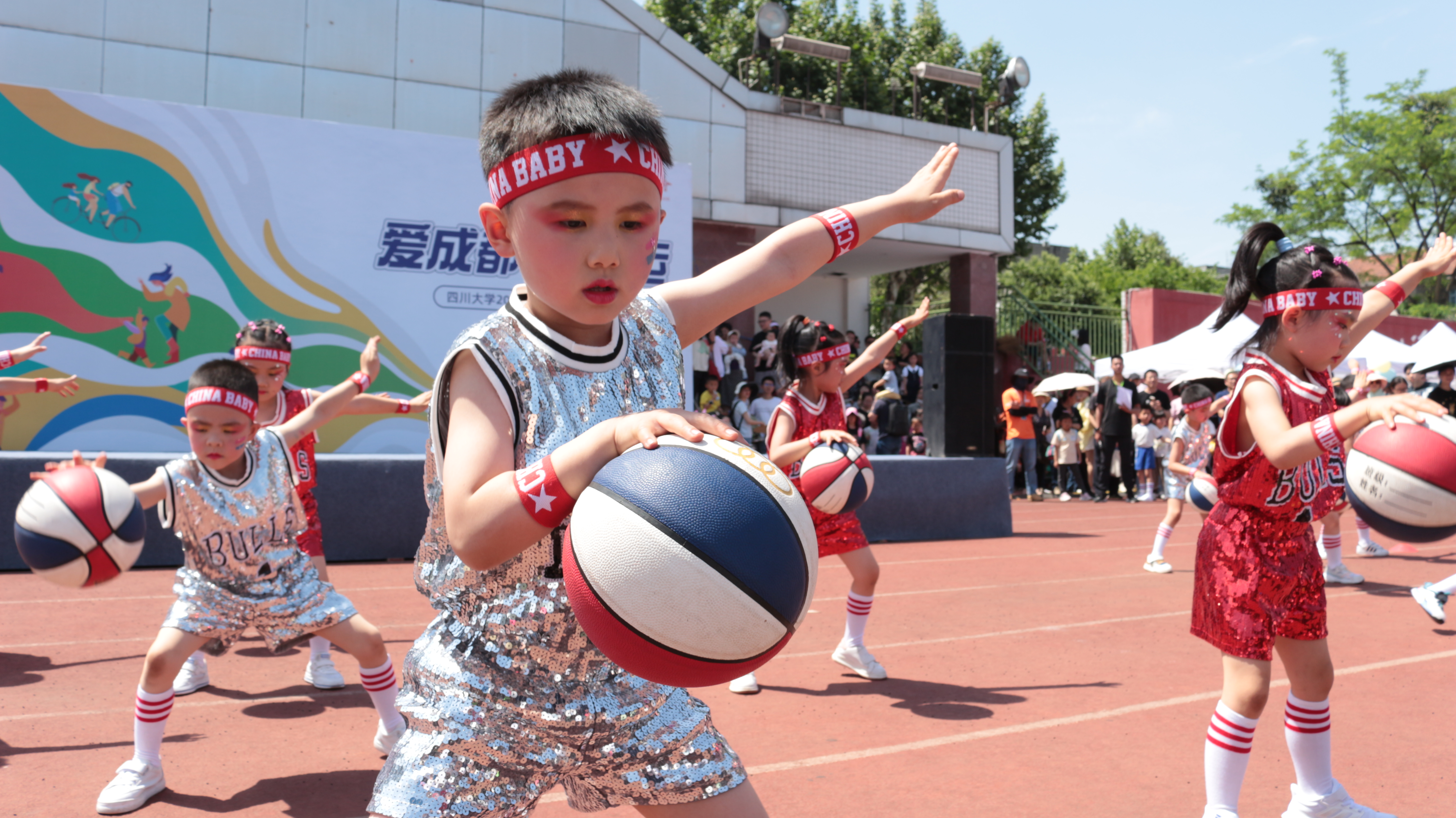下午2点半,四川大学校工会常务副主席袁斌宣布亲子趣味运动会正式开幕。来自四川大学第一幼儿园、四川大学华西幼儿园、四川大学第二幼儿园的小朋友们分别带来了《绳操飞舞》《动感篮球场》和《快乐体操》等精彩的开场表演,活跃了现场的运动氛围。