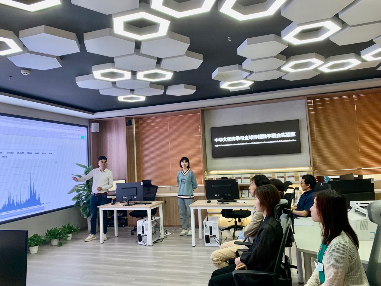 当天,北京故宫博物院数字与信息部数字资源组组长孙竞一行还参观了我院数字人文典籍大数据分实验室、数字文学场景沉浸实验分实验室和数字多模态符号认知分实验室,深入了解了我院数字人文研究课题与成果、方法与视角等相关情况,并就相关问题进行了充分探讨。