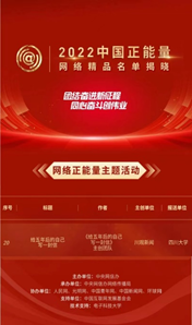 近日,2022年中国正能量网络精品终选结果出炉,550件网络正能量作品脱颖而出。四川大学文学与新闻学院报送的3件作品分别获得两类奖项:四川大学华西医院作品“华西医院辟谣小分队”和新华社四川分社作品“‘Pandaful熊猫社区’多语种生态文明国际传播专栏”入选网络正能量专题专栏类精品;川观新闻主创的“给五年后的自己写一封信”入选网络正能量主题活动类精品。这是我院首次作为推评单位参与推荐年度正能量网络精品,我院共推荐十件参赛作品,其中三件作品入选2022中国正能量网络精品名单。