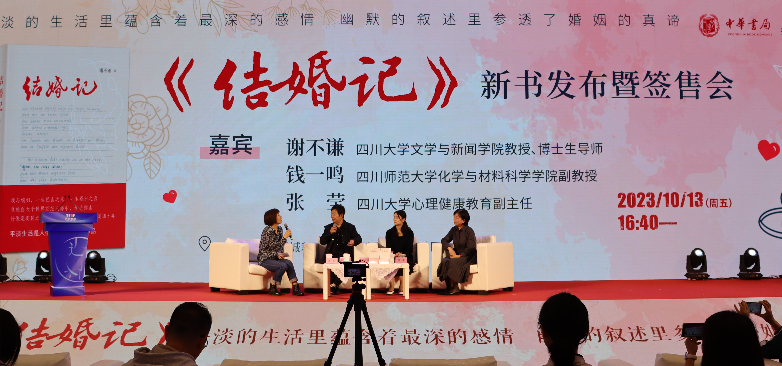 2023年10月13日与15日,由中华书局出版、我院退休教授谢谦老师创作的散文集《结婚记》新书发布会暨签售会、新书分享会分别于成都世纪城新会展中心和文轩BOOKS成华店成功举办。与会嘉宾有谢谦夫妇、四川大学心理健康教育中心副主任张莹、原成都商报副主编郑晔与该书责任编辑马燕等。