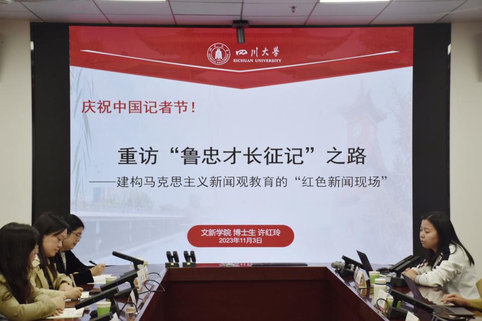 11月3日下午,四川大学文学与新闻学院举办了马克思主义新闻观学习之中国记者节专题报告会,我院2022级传播学博士研究生许红玲作题为“重访‘鲁忠才长征记’之路——建构马克思主义新闻观教育的‘红色新闻现场’”的分享。四川大学文学与新闻学院副院长操慧教授主持报告会,四川大学讲席教授、中国人民大学荣誉一级教授陈力丹云端出席,新华社四川分社对外采访部主任童芳、四川日报首席编辑黄志凌、四川日报全媒体首席记者王眉灵、新华社四川分社机关妇委会主任袁菱、新华社四川分社新闻信息中心党支部党员代表庞松、新华社四川分社团委委员侯雨辰及学院部分师生共同参与。
