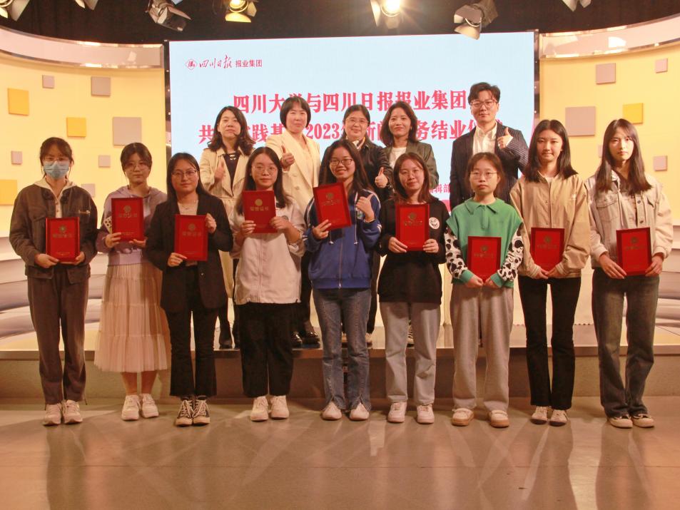 首先,我院实习带队老师、新闻学教研室骆世查副研究员宣布了优秀实习生名单。权瑞妮、张宇、都杨洁等11名同学被评为优秀实习生。随后,由到场嘉宾川报集团传媒研究中心主任兼《新闻界》总编辑段吉平、传媒研究中心副主任兼《新闻界》副总编辑杨国庆、我院副院长操慧教授、骆世查副研究员、马烨老师为优秀实习生颁发荣誉证书并合影留念。