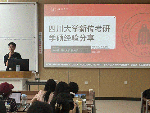 2024年5月17日下午,在2021级本科辅导员段化鞠老师的组织下,我院2024年考研经验分享会在江安校区综合楼C座304、305教室成功举办。本次分享会邀请了我院2020级考研录取至南京大学、同济大学、四川大学等国内知名高校的优秀本科生同学进行分享,同时也邀请了新东方的考研英语老师周芝娜分别对中国语言文学和新闻传播学两个学科的考研情况进行整体解读。分享会得到了2020级本科生专职辅导员胡余龙老师的大力支持,由2021级本科生兼职辅导员王小翠、张颢琳老师主持。