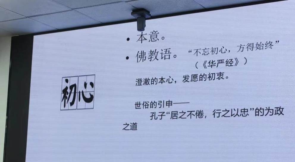 课程伊始,李怡院长首先围绕“初心”一词的本意进行细致论述,使同学们了解到“初心”作为佛家语“澄澈的本心、发愿的初衷”的原始含义,并对其泛化引申后“人原初之愿望”的人文意蕴和“居之不倦,行之以忠”的政治意涵有了更清晰的认识。