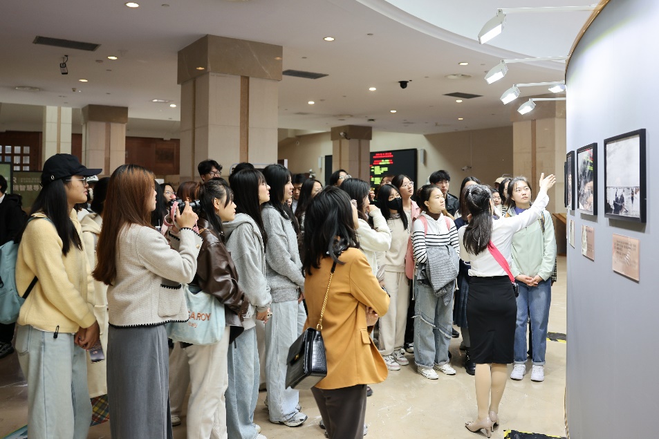 在展览现场,我院师生跟随讲解员的步伐,沿着螺旋型走廊参观。从1982年体操运动员吴佳妮高低杠腾跃瞬间到2024年网球运动员郑钦文夺冠后挥拍庆祝的瞬间,从东方红一号卫星发射再到我国第一辆国产大飞机C919的生产装配,一张张经典照片让师生们驻足观赏,体悟光影让瞬间成为永恒,感受镜头定格历史作为记忆的独特魅力。
