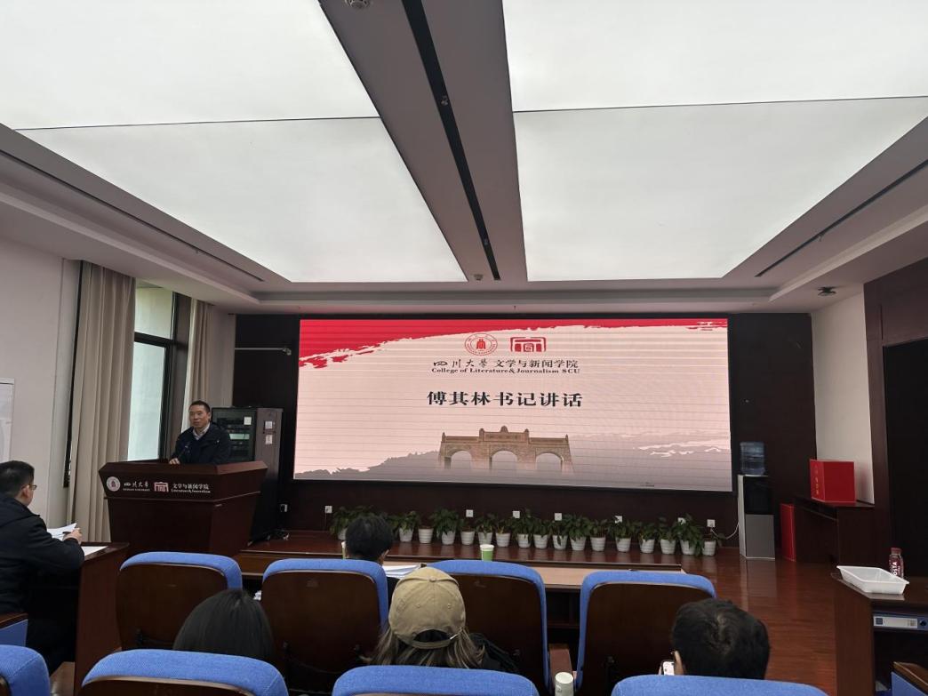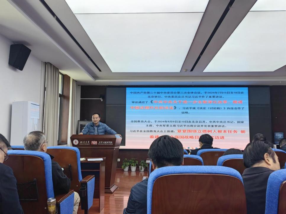 11月29日,学院在江安校区文科楼一区526会议室召开学习贯彻党的二十届三中全会精神宣讲会暨全院教职工大会。文学与新闻学院领导班子、全体教职工、离退休教师代表和学生代表参加会议。会议由院党委书记傅其林教授主持。