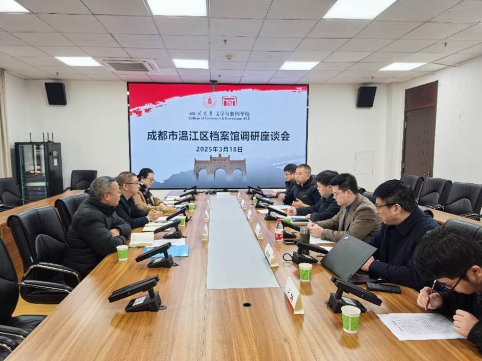 2025年3月18日下午,成都市温江区档案馆朱乐明馆长一行到访我院交流参观,就开展深度合作进行座谈。会上,双方一致认为档案具有重要的学术价值、经济价值、社会价值,并重点围绕合作平台搭建、档案资源深度挖掘等问题进行了探讨。