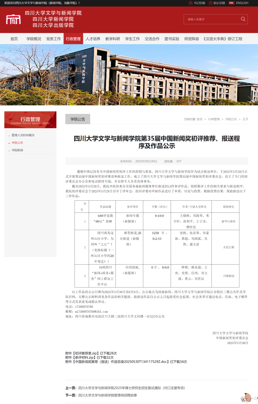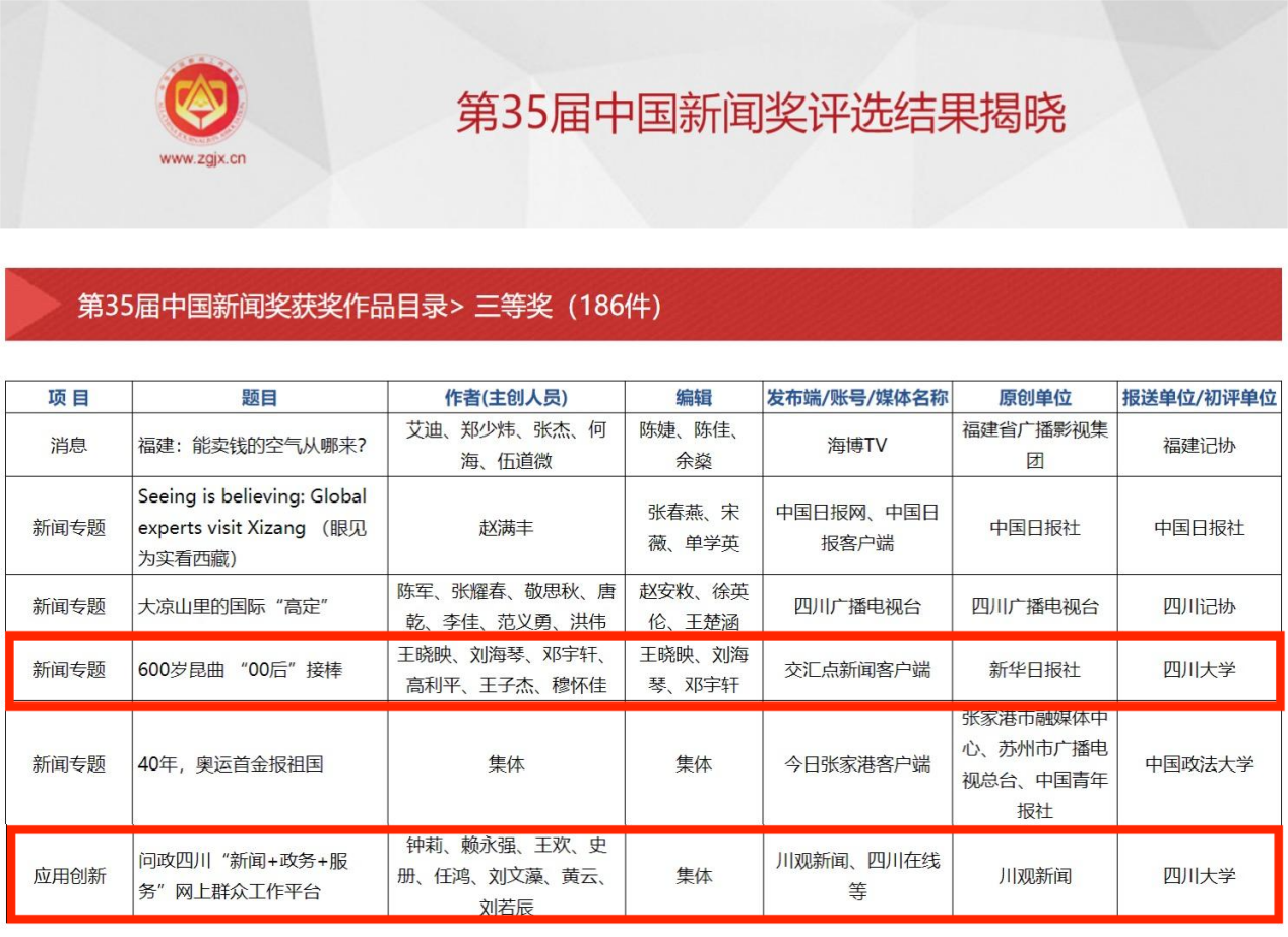 2025年11月5日,中华全国新闻工作者协会主办的第35届中国新闻奖评选结果揭晓。四川大学文学与新闻学院报送的新华日报社作品《600岁昆曲 “00后”接棒》和川观新闻作品《问政四川“新闻+政务+服务”网上群众工作平台》分别荣获新闻专题类和应用创新类三等奖。