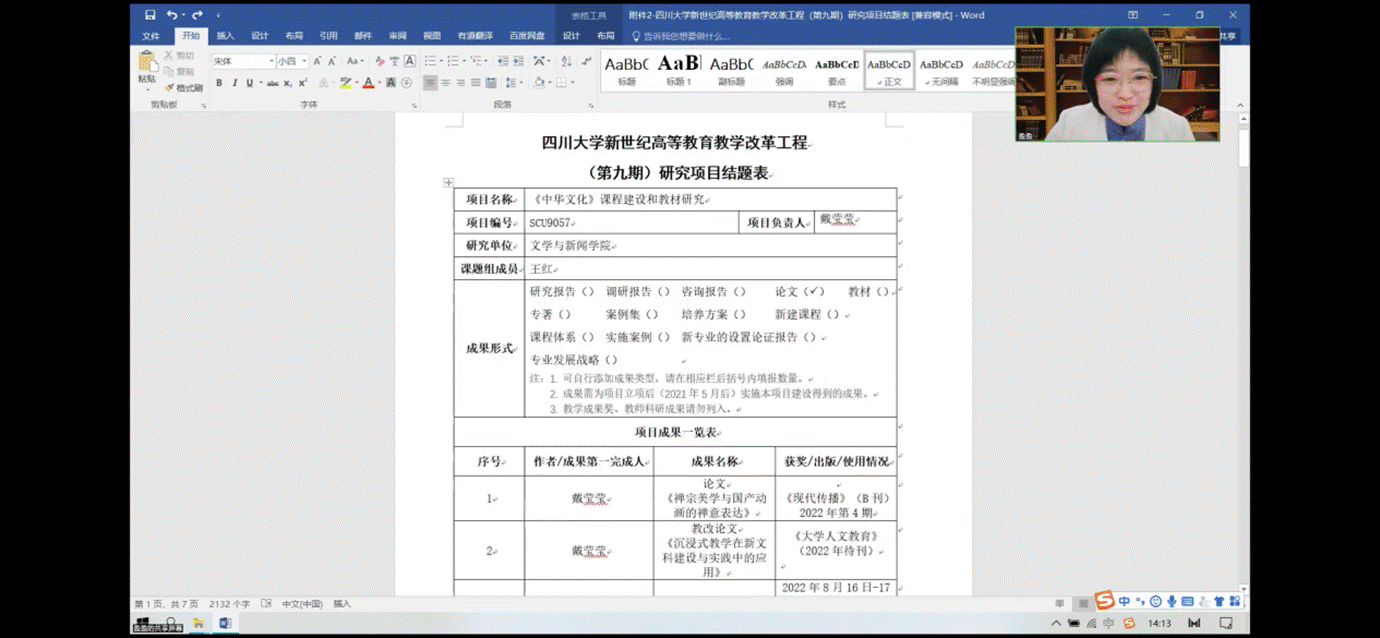 2022年11月14日,根据学校《关于开展四川大学新世纪高等教育教学改革工程 (第九期)研究项目结题工作的通知》要求,我院认真组织进行了九期教改项目的结题初评会议。会议由我院副院长罗鹭教授主持,本科教务办主任周仁平老师、本科教务宋雯老师出席了会议。我院项目负责人和成员老师代表进行了项目汇报。