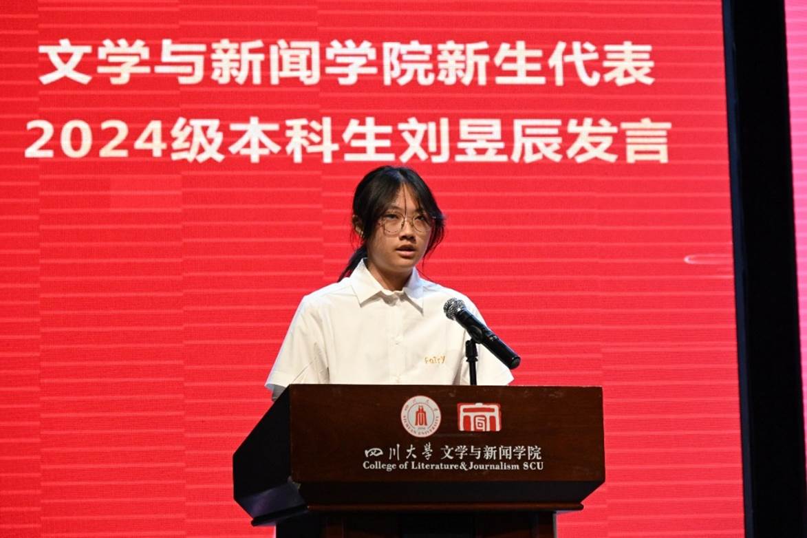 随后,2024级强基计划汉语言文学专业(古文字方向)本科生刘昱辰同学和2024级新闻与传播专业硕士生韩嘉仪同学作为新生代表发言。刘昱辰同学表示,学在文新,需要充分调动我们的主观能动性,为自己的学习拓展更广阔的知识版图,不负前人期望,为学校贡献新的力量,为祖国谱写新的华章。韩嘉仪同学则是分享了他作为四川大学第25届研究生支教团甘洛分团团长参与西部计划志愿者乡村教育专项活动,到凉山州甘洛县开展支教工作的实践经历。他表示,无论身处何地,希望我们都能不忘祖国的栽培,挺膺担当,为社会的进步与发展贡献力量。