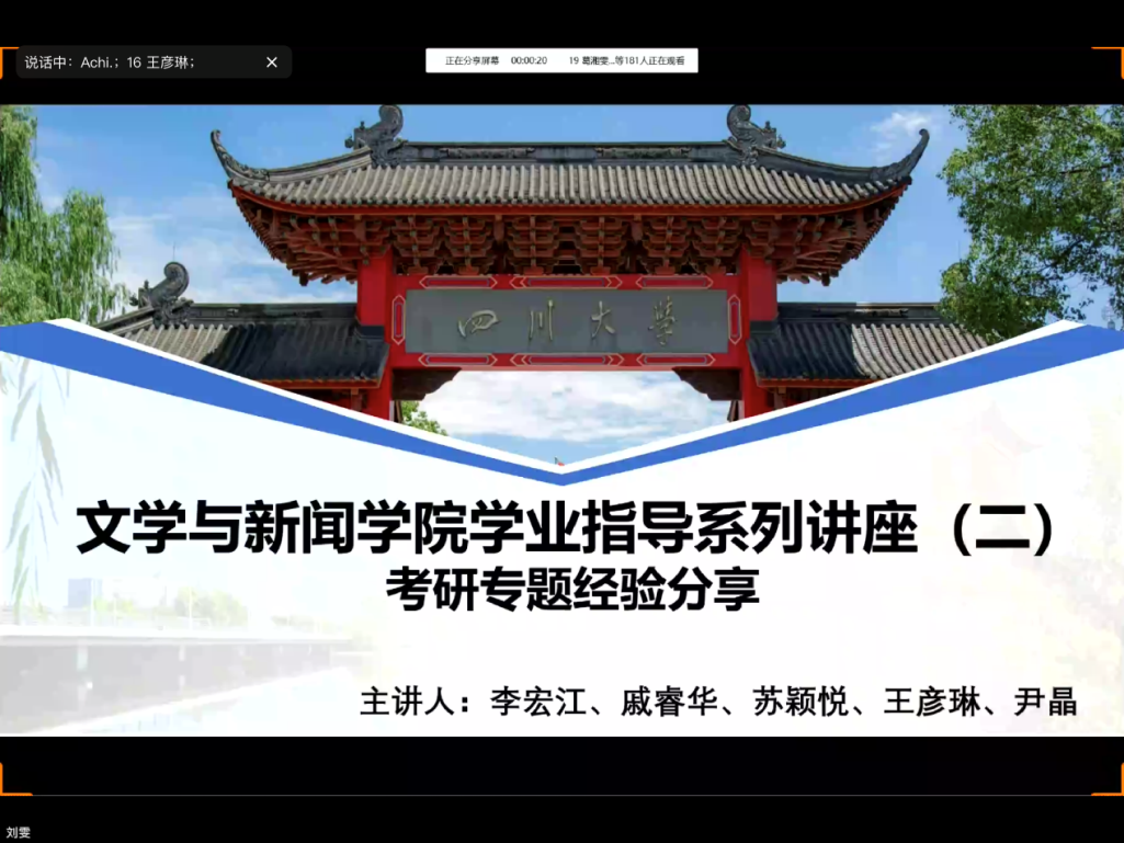 会上,分享同学结合个人专业和考研院校特点,从如何确定目标、制定复习计划、搜集考研信息、调节情绪和心态等方面详细介绍了自己的考研经验。其中,考入复旦大学新闻与传播专业的王彦琳同学主要介绍了个人备考节奏,提醒同学注意专业课的复习技巧,形成个人的解答风格,避免答题样版化;考入四川大学传播学专业的李宏江同学着重分享了备考期间的时间管理和心态调节经验,建议同学们通过适当的运动缓解压力,在劳逸结合中提升学习效率;考入吉林大学古文字学专业的戚睿华同学总结个人经验教训,介绍了考研五大雷区,强调备考要根据自身特点,不要贪大求全;考入中国传媒大学互联网信息专业的苏颖悦同学分享了从2019年3月到12月的备考时间线,并强调须根据不同时间节点的备考进度做针对性的经验总结;考入四川大学现当代文学专业的尹晶同学主要讲述了政治和英语两门公共课的学习方法,提醒同学们反复练习政治选择题和背诵英语单词;考入浙江大学古典文献学的徐迪同学以文字稿的形式向同学们介绍了备考经验。