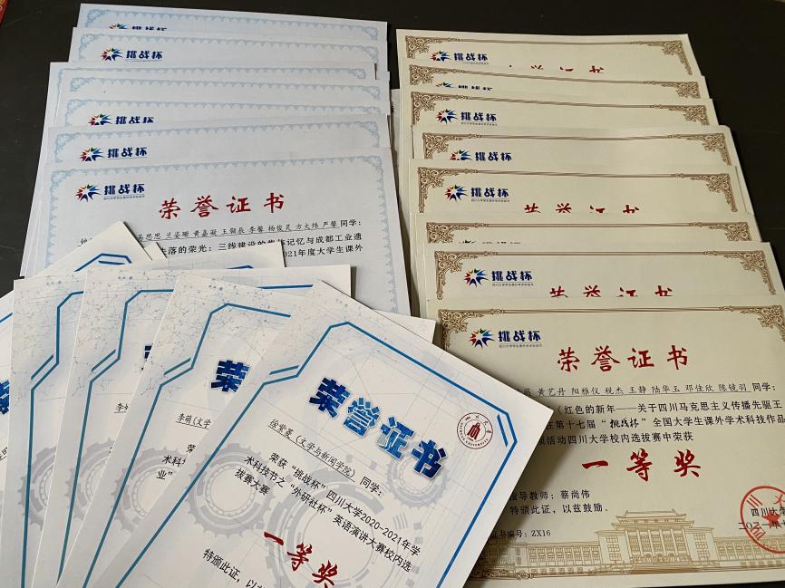 我院在“课外学术作品竞赛”一项中获得了37.51分,位列全校第四。此外,单项得分最高的是“课外学术科技作品竞赛红色专项活动”,得分为36.3365分,位列全校第一。上一学年,我院涌现出了一批好团队、好作品,在挑战杯系列赛事中屡获奖项。其中,共8支队伍共计60人次在“挑战杯”四川大学2020-2021年度大学生课外学术科技作品竞赛中斩获奖项,7个团队或个人在“挑战杯”四川大学2020-2021年学术科技节之英语演讲大赛、国学知识竞赛、广告艺术大赛等多个赛事中取得好成绩。此外,另有10支队伍共计86人次在红色专项活动四川大学校内选拔赛中获得不同奖项,体现了我院学子传承红色基因、在实践中践行初心使命的青春风采。