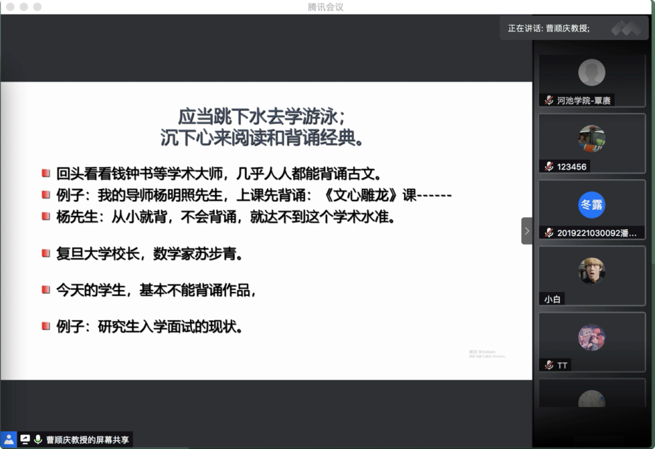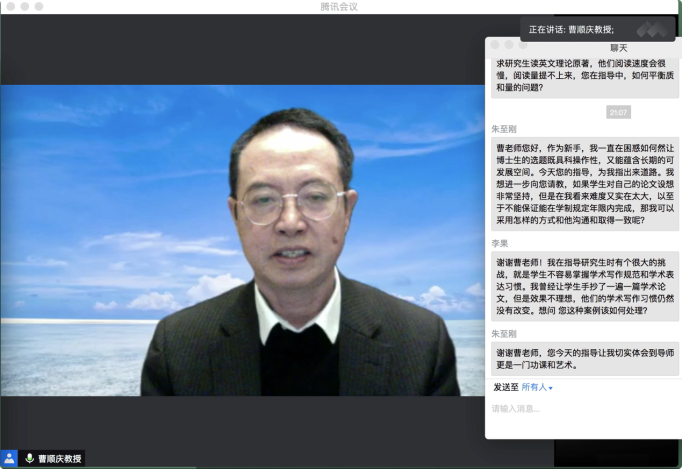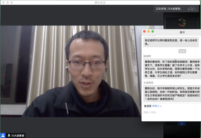 10月16日19:30,“传薪·研究生培养问题与方法系列活动”第一场在腾讯会议平台顺利举行。四川大学杰出教授、四川大学文学与新闻学院学术院长曹顺庆教授应邀作题为“培养研究生的几点体会”的讲座,我院副院长胡易容教授担任讲座主持人。