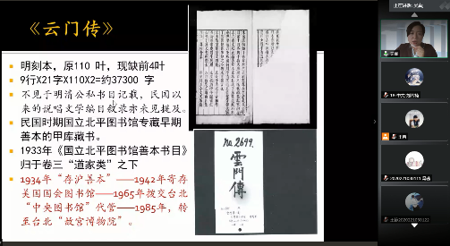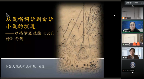 2020年10月15日下午3:30,中国人民大学文学院吴真教授应邀作题为“从说唱词话到白话小说的演进——以冯梦龙改编《云门传》为例”的在线主题讲座。我院丁淑梅教授任讲座主持人,学院内外300余名师生在线参与。