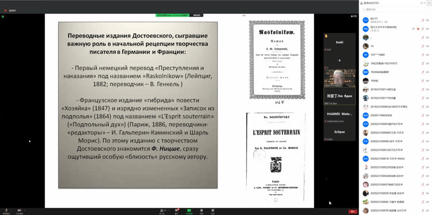 11月20日下午与11月24日晚上,俄罗斯科学院高尔基世界文学研究所所长В.В.波隆斯基教授应四川大学文学与新闻学院之邀,为俄罗斯文学研究者和听众们带来了题为“19至20世纪俄罗斯文学史学术建构的主要方法”与“西方视野中的陀思妥耶夫斯基创作”的线上讲座。我院刘亚丁教授担任两场讲座的主持人。
