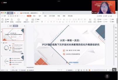 北京师范大学元英老师以《认知•体验•反应:IPOP 理论视角下元宇宙对未来教育的优化升维路径研究》为题,从体验偏好理论视角切入,从认知层、体验层与反应层深入分析了元宇宙技术对未来新闻教育的影响。她总结到:从“隐形技术”走向“引擎支撑”、从“简单应用”走向“深度融合”,元宇宙是深化教育改革,推动教育发展的重要载体。同时,“元宇宙+教育”并不是对于传统教育的取代,而是在“扬弃”的底层逻辑下对教育内涵的丰富与拓展。