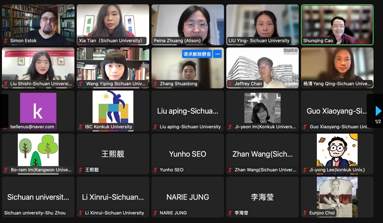 四川大学杰出教授、文学与新闻学院学术院长、欧洲科学与艺术院院士曹顺庆教授,刘颖教授,王一平教授,庄佩娜副研究员,杨清老师,张帅东老师,博士研究生刘诗诗,硕士研究生吴白羽,与来自韩国建国大学、美国纽约州立大学奥尔巴尼分校、韩国成均馆大学、韩国庆熙大学、新加坡大学、澳大利亚西悉尼大学、印度新德里国立伊斯兰大学等多所世界高校的专家学者,围绕人类与非人类的共生关系、现代技术与伦理思考等议题作了线上报告。在各方协同合作下,各国学者切磋交流、互学互鉴。