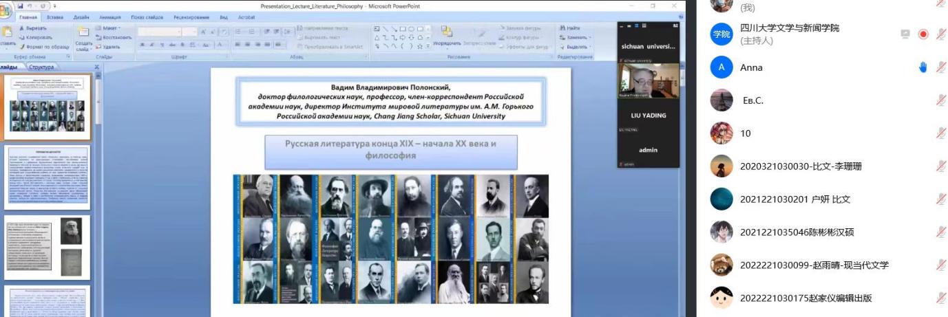 2022年12月8日下午两点至五点,俄罗斯科学院高尔基世界文学研究所所长В. В. 波隆斯基教授应四川大学文学与新闻学院之邀,为听众们带来了题为“十九世纪末-二十世纪初:俄罗斯哲学与文学”的线上讲座。四川大学文学与新闻学院教授、四川大学中华文化研究副院长、四川大学当代俄罗斯研究中心学术委员会主席刘亚丁担任此次讲座的主持人及翻译。