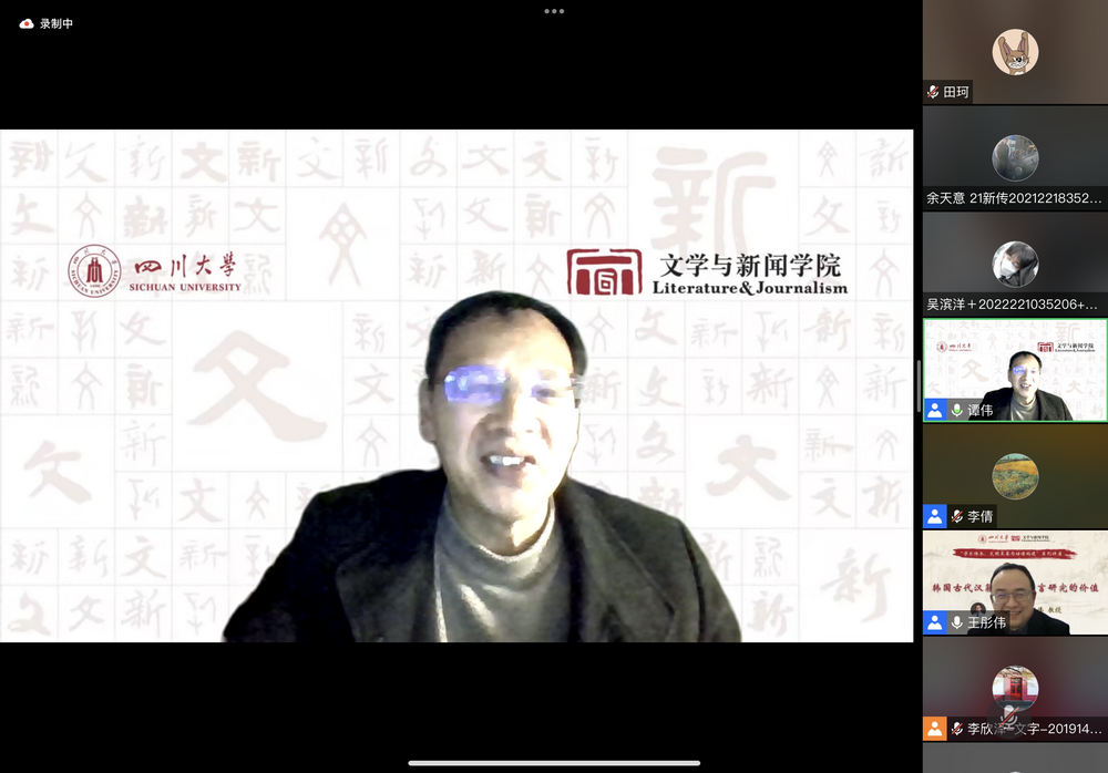 2023年2月24日,我院主办的“学术传承、文明互鉴与话语构建”系列讲座第二讲在线上顺利举行。四川大学文学与新闻学院教授,中国俗文化研究所教授,博士生导师,四川大学人事处副处长兼青年教师与专职科研队伍管理办公室主任,四川省传统文化社科普及基地副主任王彤伟教授作了“韩国古代汉籍文献及语言研究价值”的主题讲座。讲座由我院谭伟教授主持,校内外师生近200人参与。