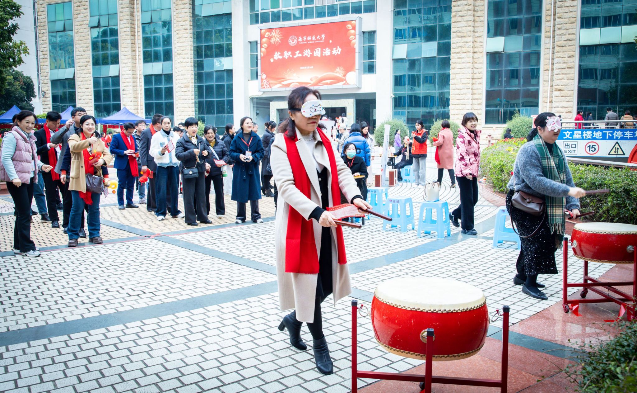 上午10:00,教职工游园活动在明秀校区喷泉广场举行。活动现场热闹非凡,欢声笑语此起彼伏。精心设置的开门大吉、财源滚滚、匠心拾珠、捷报频传、轻舞飞扬、百发百中、环环相扣、幸运投壶、智慧爱校、写春送福等10个形式多样、新颖有趣的游园项目,深受现场教职工好评。其中由陆以宏、朱军献、钟勇、张巧平、管义怀等教师组成的写春联送祝福团队,带领美设学院书法专业研究生,现场为教职工送出100余副春联。